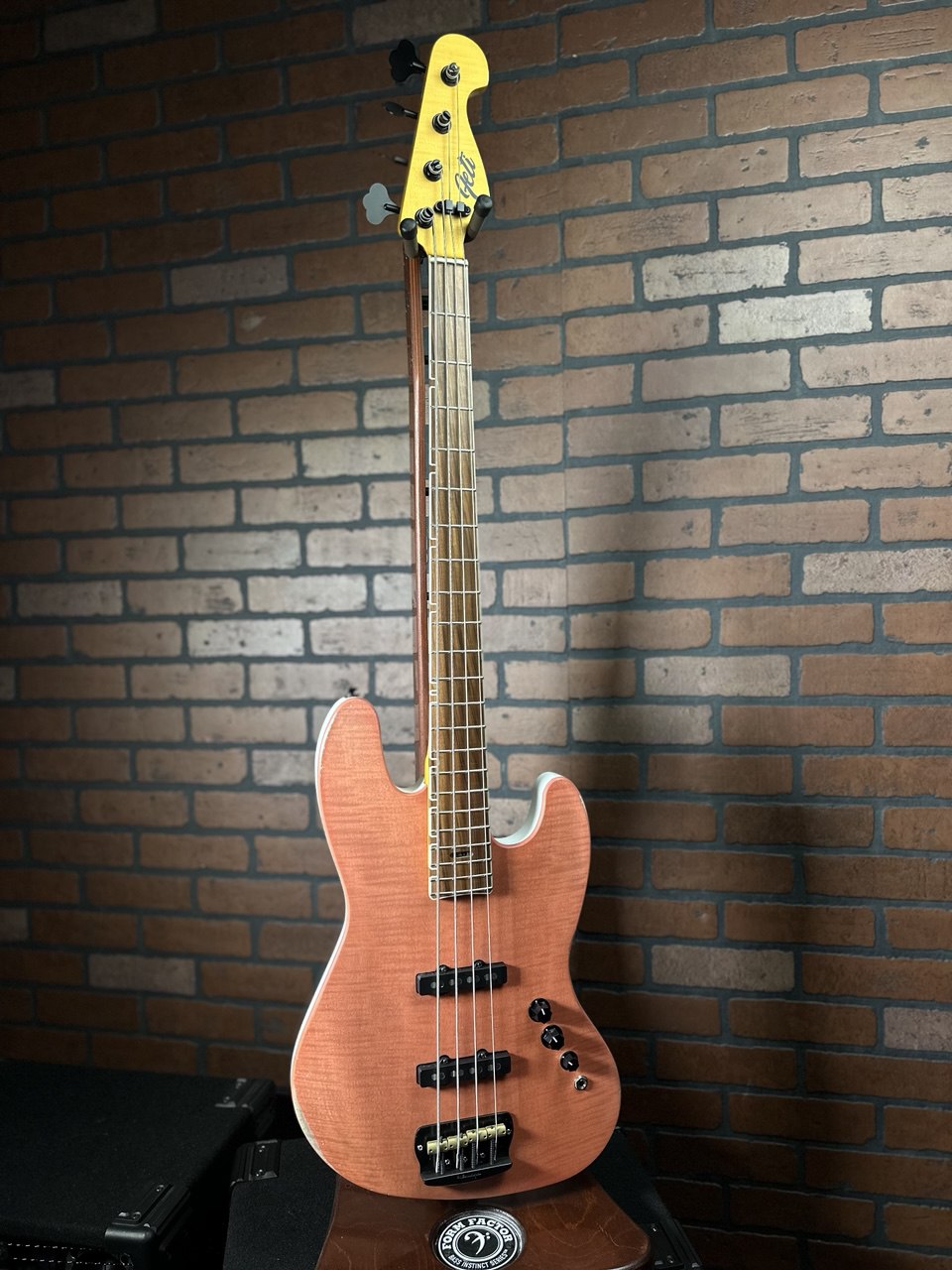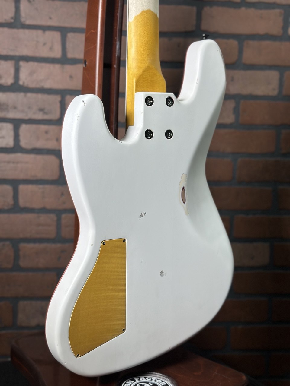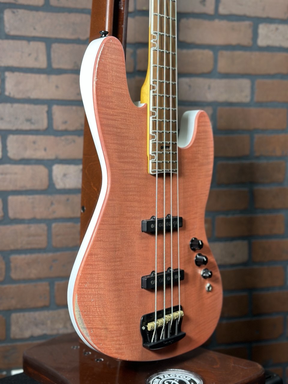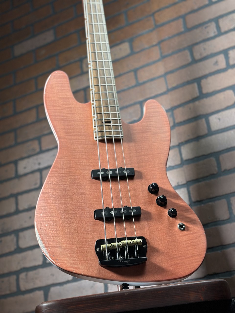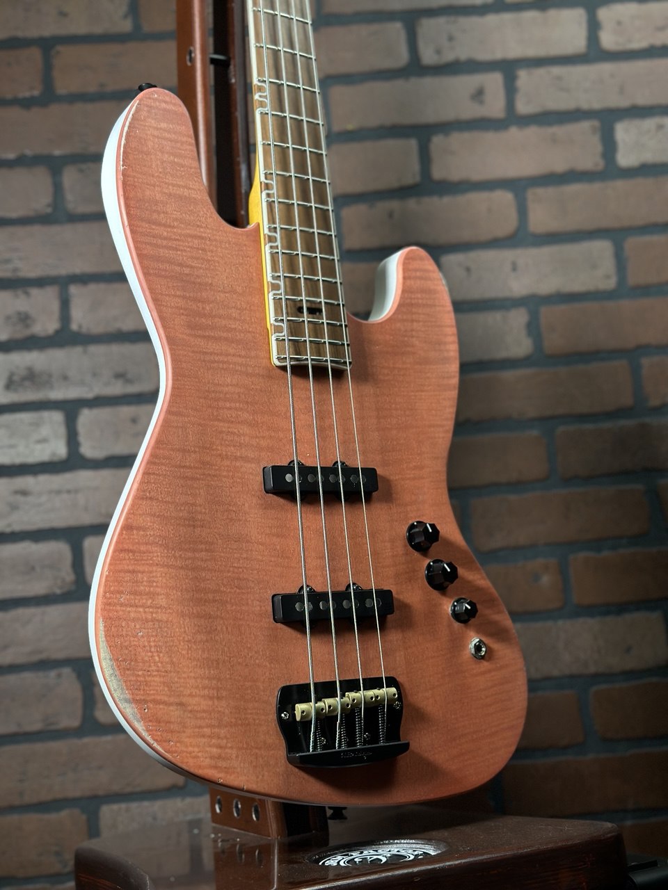 • Built in Los Angeles This handcrafted 4-string bass guitar is a boutique instrument designed for players who value tone, feel, and individuality. Built with carefully selected tonewoods and classic electronics, it delivers a balanced, articulate sound with modern reliability and vintage character. The alder body paired with a flamed maple top provides punchy lows, clear mids, and a focused high end. A flamed maple neck with a satin polyurethane finish offers a fast, comfortable playing experience, while the Pau Ferro fretboard adds warmth and smooth response. Dual single-coil pickups in a classic Jazz Bass configuration deliver a wide tonal range — from deep, round lows to bright, cutting articulation. Simple and intuitive controls make this bass equally at home on stage, in the studio, or in a professional touring setup. A subtle relic finish on the back of the body adds tasteful vintage character without compromising durability or performance. ⸻ Specifications: